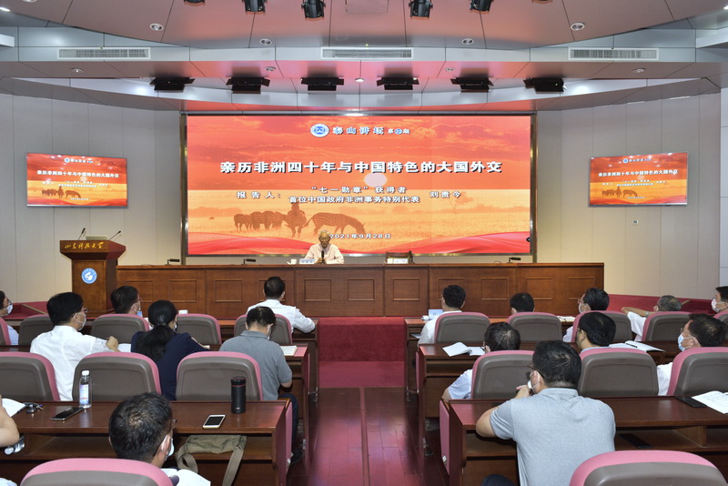为深入学习贯彻习近平总书记在庆祝中国共产党成立100周年大会上的重要讲话精神,进一步推动党史学习教育走深走实,9月28日,学校举办第32期“泰山讲坛”报告会,特邀“七一勋章”获得者、首位中国政府非洲事务特别代表刘贵今来校做《亲历非洲四十年与中国特色的大国外交》专题报告。