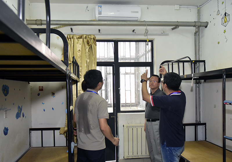 8月12日,校党委书记罗公利来到学生公寓楼检查空调安装工作。副校长曾庆田,学生工作处、基建处、安全管理处主要负责人陪同检查。