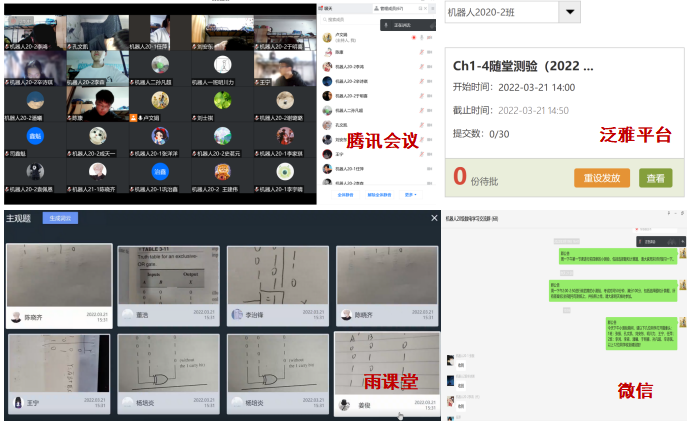 “变的是媒介,变的是方式;不变的,依然是课程的深度和厚度。”电工电子中心党支部书记卢文娟老师本学期承担机器人2020级的《数字电子技术》(双语)授课任务,她选用“腾讯会议+雨课堂+泛雅平台+微信”多模态组合方式进行线上教学。腾讯会议分享屏幕进行课程内容讲授,可以导出会议记录,及时了解本次课学生的参与情况;利用雨课堂随时推送小测试题,增进师生互动,既可以检测学生对课堂内容的掌握情况,又可以督促学生认真听课;利用泛雅平台建课,上传课件等学习资料,发布作业、章节测验等考核环节,平台数据可作为平时成绩考核的依据;利用微信群发布通知,进行辅导答疑,提供及时的全方位学习指导和支持。